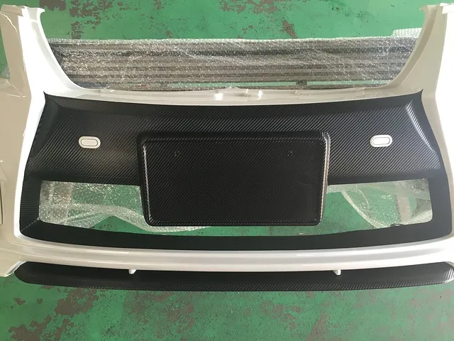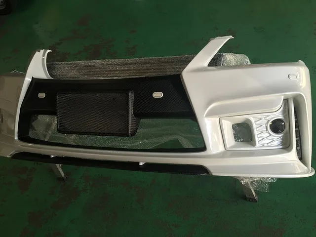 オートショップY様からのご依頼。クラウンのエイムゲン製フロントエアロバンパーにカーボンファイバーブラックをラッピング。通常、部分的に黒色カラーらしいのですが、それでは味気ないとカーボンブラックをご希望で細かな細工をして施工しました。